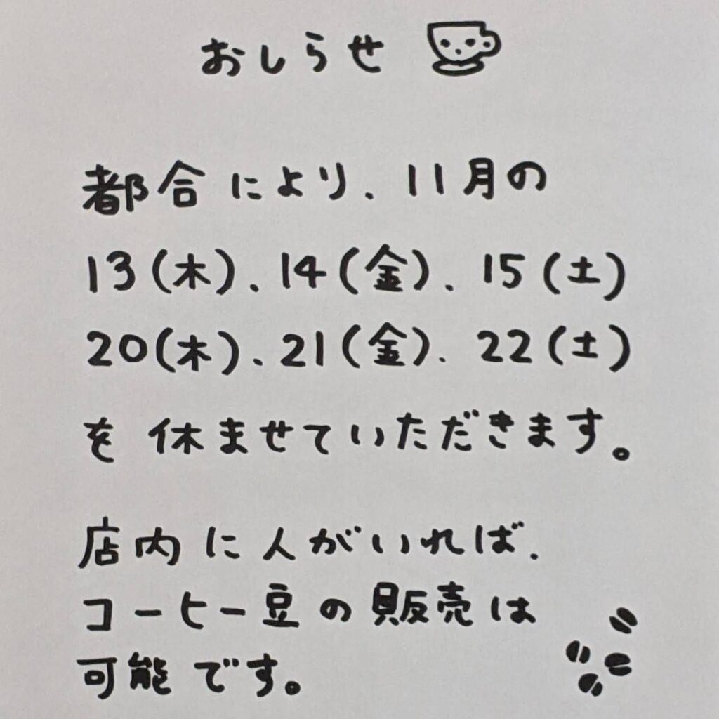 11/13,14,15,20,21,22日と休みます。 シテンの人手不足と家のことなどが重なり2週間お休みをいただきます。 特に旅行に行ったりということははいのですが、もし焙煎などして中にいる時は豆売り対応くらいはできますのでお声がけください。 2025年11月11日