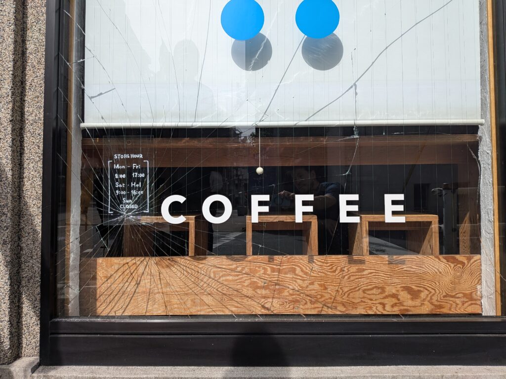 もう夏になりそうな気温でタオルケットを被って寝ていると嫌な目覚め方でおなじみの電話のバイブ音で目が覚める。画面に出ている大家さんの名前を確認して、 「シテンで何かあったかぁ…」 と通話ボタンをタップする。 「杉浦さん?おはようございます。あの、お店のガラスが割られてるというか、大きくヒビが入っちゃって。昨日の夜中に大きい音がしたとは思ったんだけど。警察には電話して来てくれるみたいだから何時ごろ来られる?」 という話だった。なんだそれ。なんでガラス割られてんだ。人手が足りないとなってから日曜は営業していないけど、どの道朝に水出しの仕込みに行かないといけないからちょっと用事が増えただけという感じだった。 さて、自転車を走らせて20分。シテンのある道にでると警察官の姿が見える。現場検証みたいなことをしてるよこで件の窓を確認すると思ったより派手に割れていた。 警察官には何を聞かれるんだろうと思ったけどあまり大したことは聞かれなかった。どうなるかはわからないけど、とりあえず犯人がいるならどうやって割られたのかが気になる。去年だったか、近所でちょっとした事件があったきっかけでシテンのまわりにはいくつか防犯カメラ設置されていたらしい。(気づいていなかった…)ということなので、今後の経過報告を待ちたいと思う。保険会社にも連絡したけど果たして自分のプランで適用があるのか。出ないとなると一体なんのための保険なんだということになり考えものである。 見聞が終わったら取り合えず店内にも少し散らばったガラスを掃き掃除して、水出しの仕込みをした。明日の水出しはコロンビア エルパライソ・ライチです。 道具箱にガムテープがあったよなーと取り出してガラスのヒビに沿って貼っていったが、思ったより全体に広がる線の総距離が長かったのでガムテープが途中でなくなってしまい中途半端だけどこの状態でしばらく営業になりそう。 こういう時に窓を変えてくれる業者とかどうやって探したらいいんだろうか。 それにしても時間がもったいないからやめて欲しい。シテンをご利用の方はしばらく危ないので窓には触れたりせずお気をつけください。